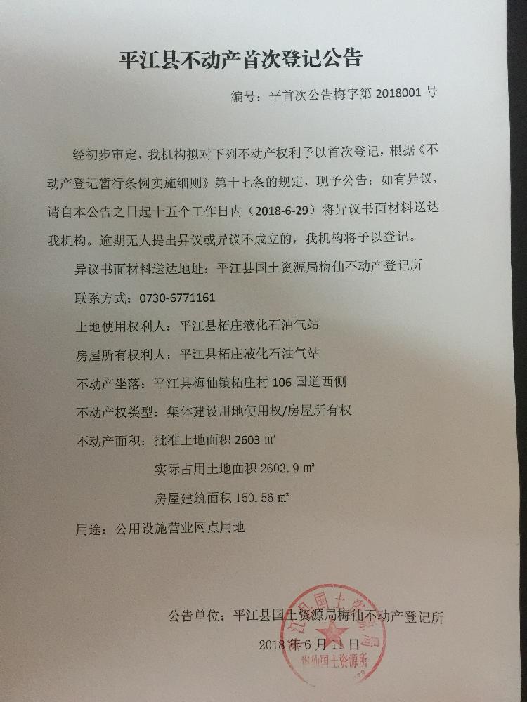 平江县柘庄液化石油气站不动产首次登记公告平首次公告梅字第2018001号