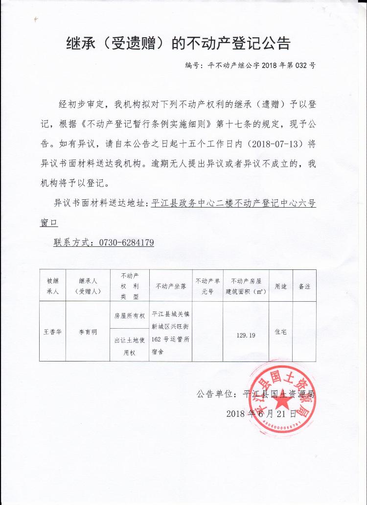 李育明继承(受遗赠)的不动产登记公告平不动产继公字2018年第032号