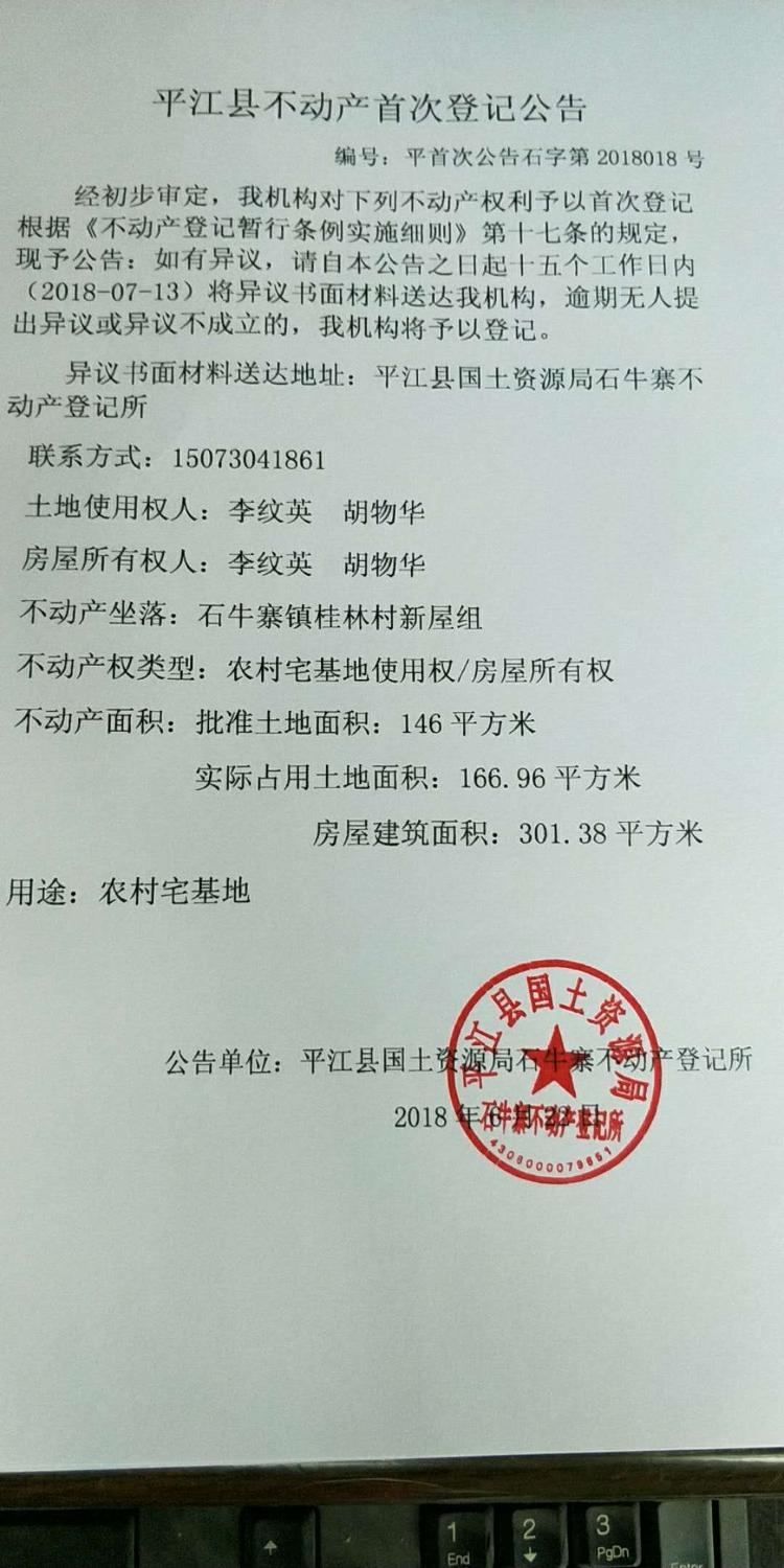 李纹英 胡物华不动产首次登记公告平首次公告石字第2018018号