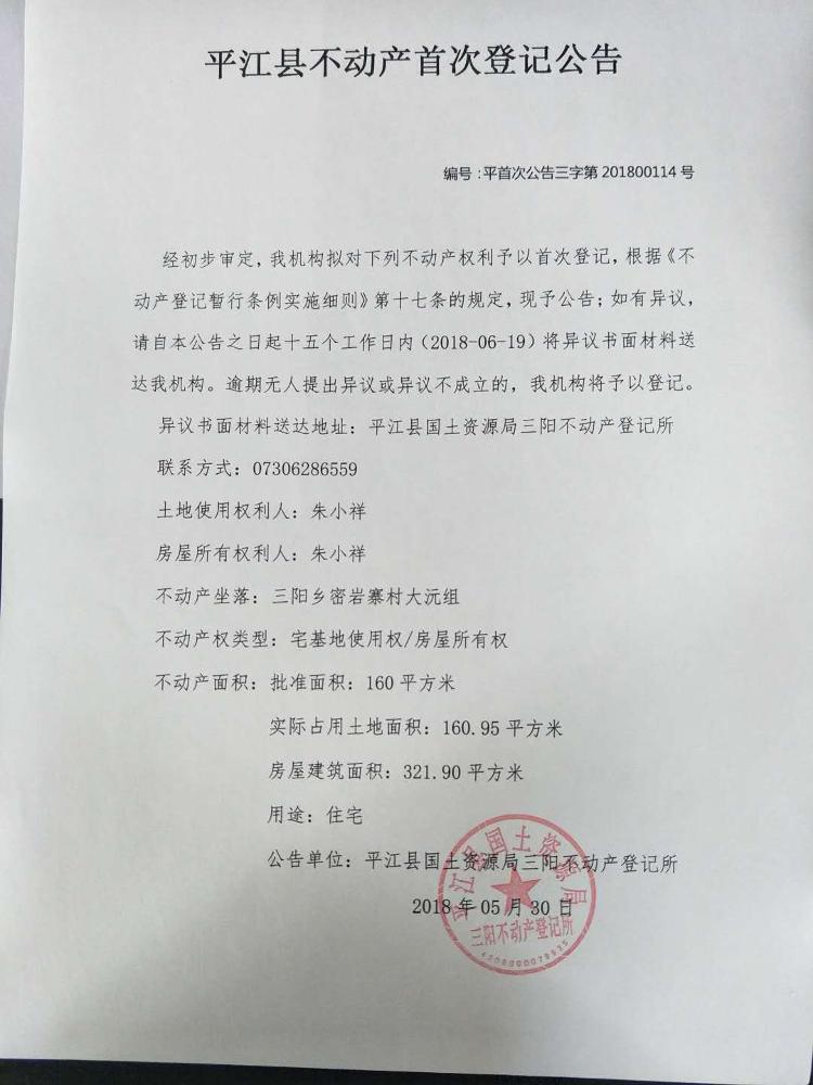 三阳乡朱小祥不动产首次登记公告