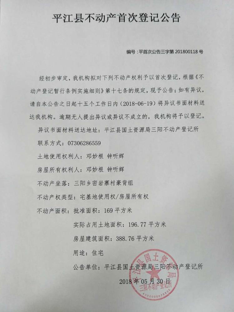 三阳乡邓妙根 钟听辉不动产首次登记公告