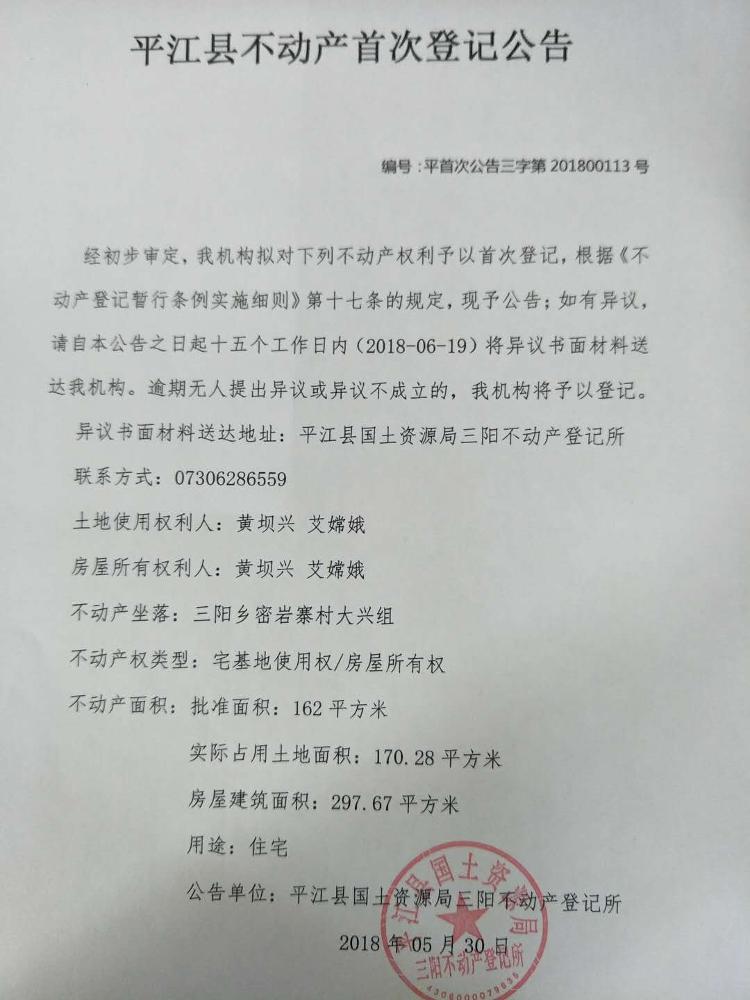 三阳乡黄坝兴 艾嫦娥不动产首次登记公告