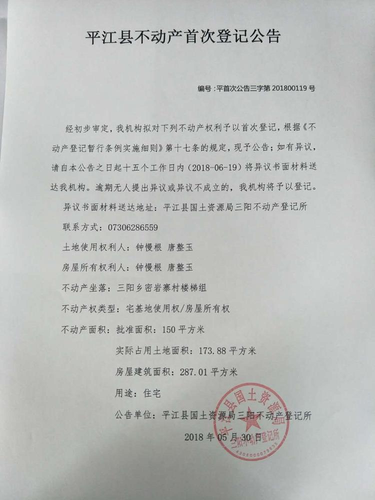 三阳乡钟慢根 唐整玉不动产首次登记公告