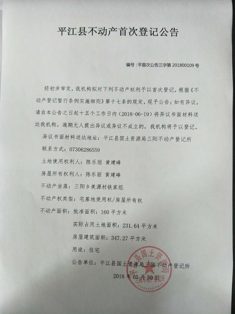 三阳乡陈乐丽 黄建峰不动产首次登记公告