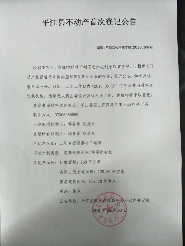 三阳乡邱备章 张庚来 不动产首次登记公告