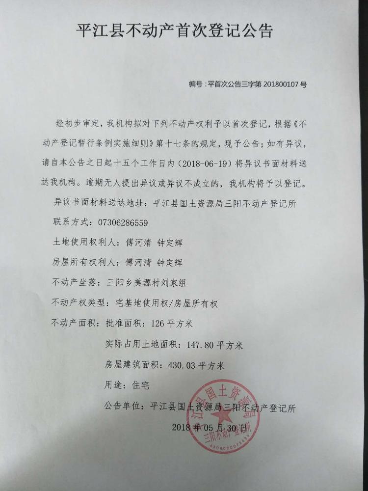 三阳乡傅河清 钟定辉 不动产首次登记公告