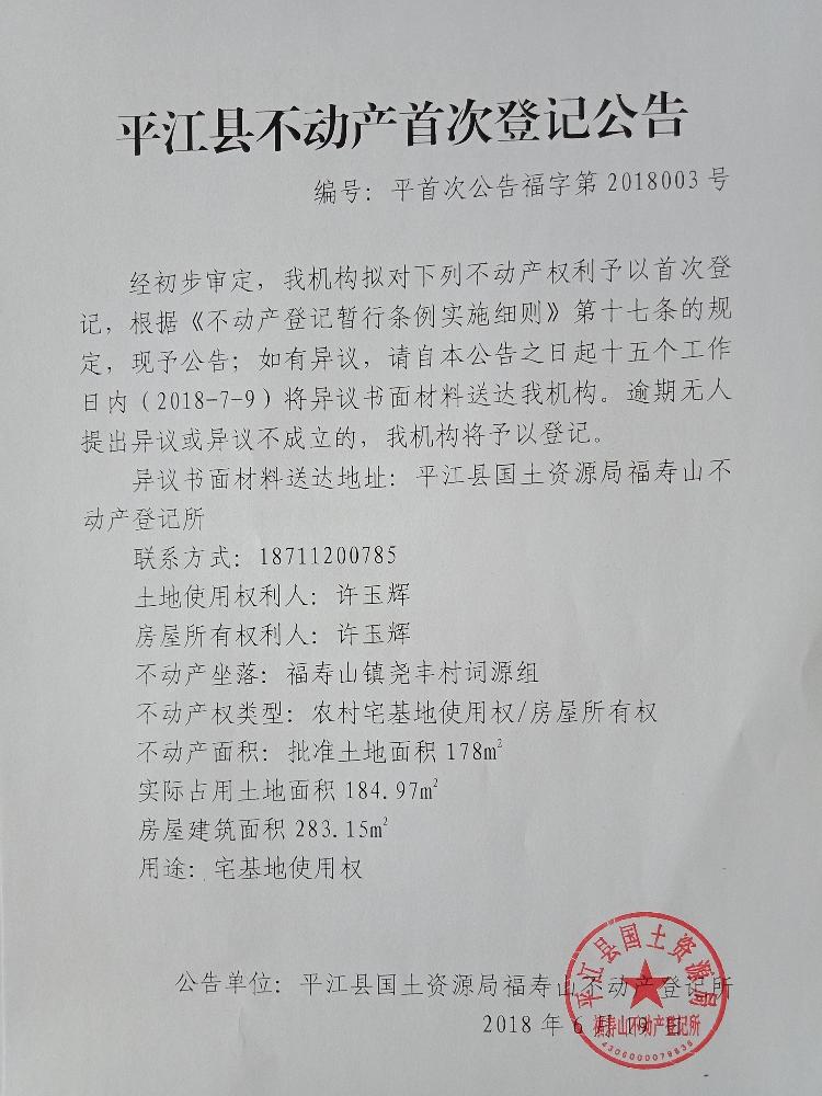 许玉辉不动产首次登记公告平首次公告福字第2018003号