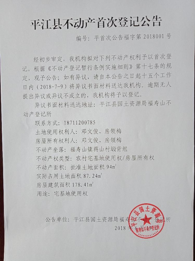 邓文俊 房领梅不动产首次登记公告平首次公告福字第2018001号