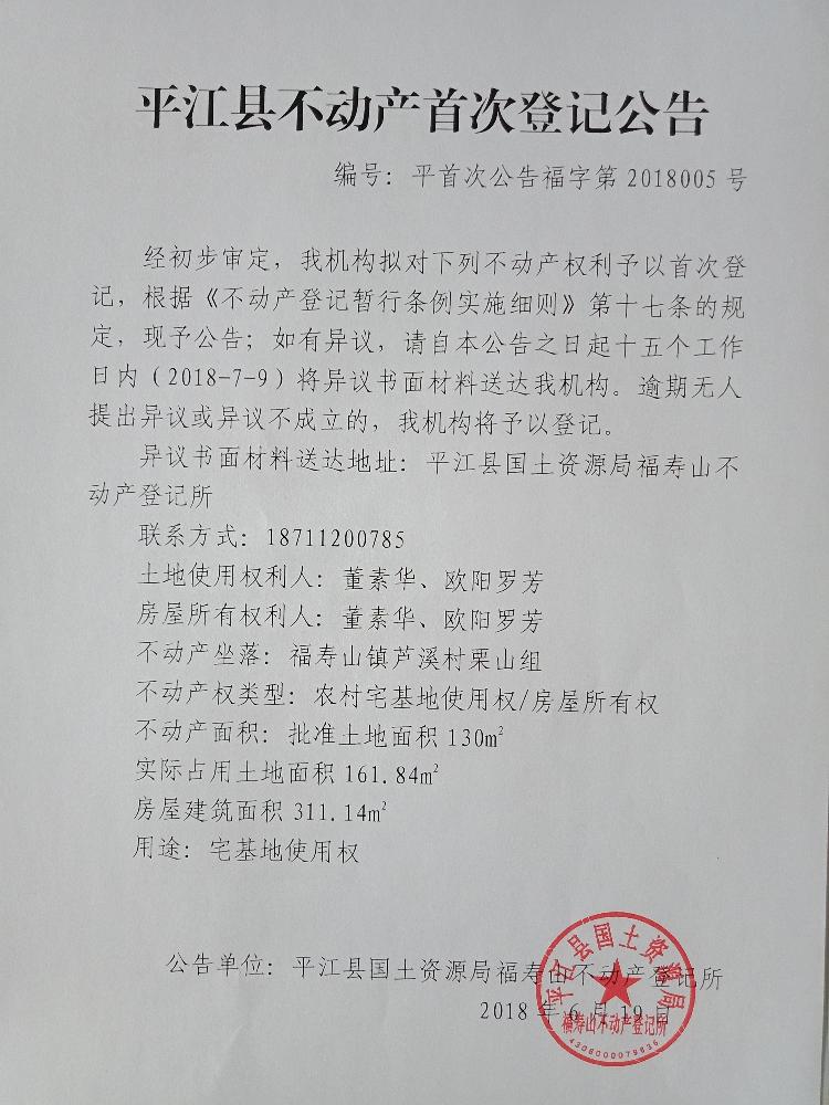 董素华 欧阳罗芳不动产首次登记公告平首次公告福字第2018005号