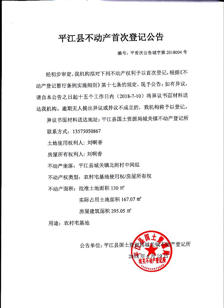 刘啊香不动产首次登记公告平首次公告城字第2018004号