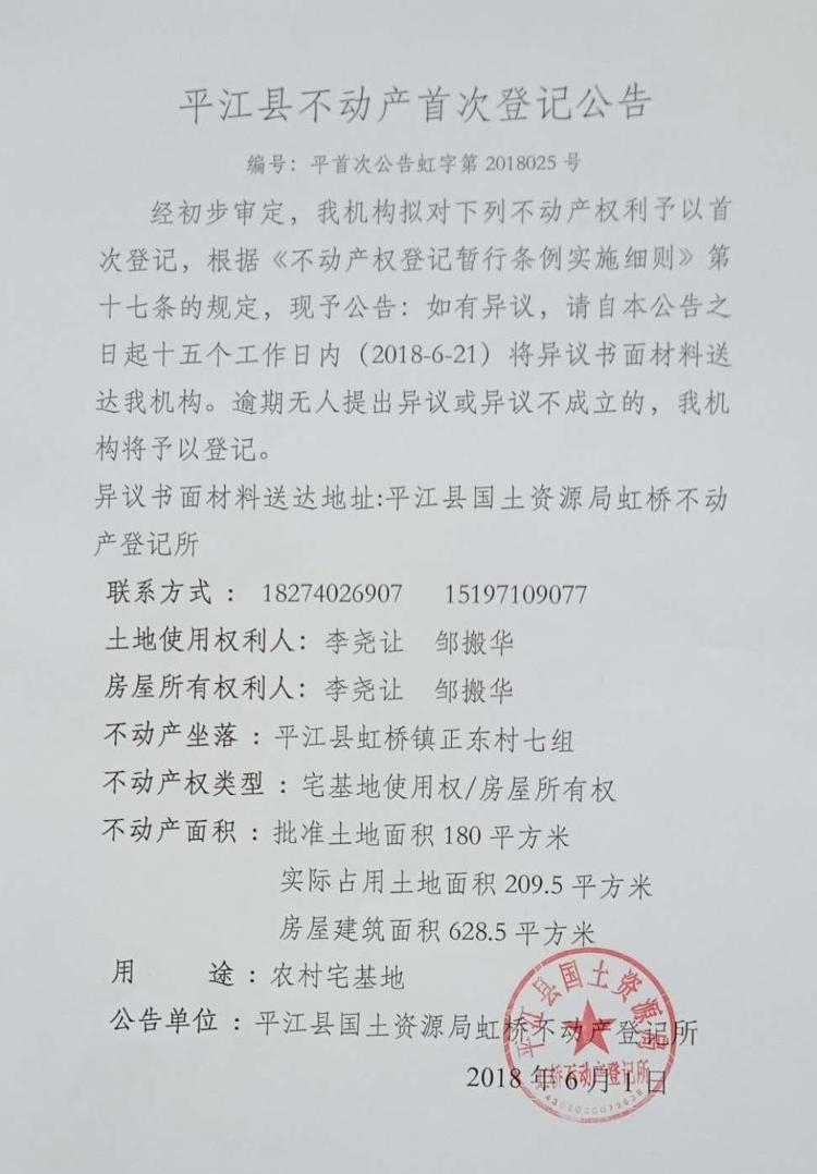 李尧让 邹搬华不动产首次登记公告平首次公告虹字第2018025号