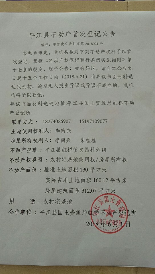 李南兴 朱桂桂不动产首次登记公告平首次公告虹字第2018021号
