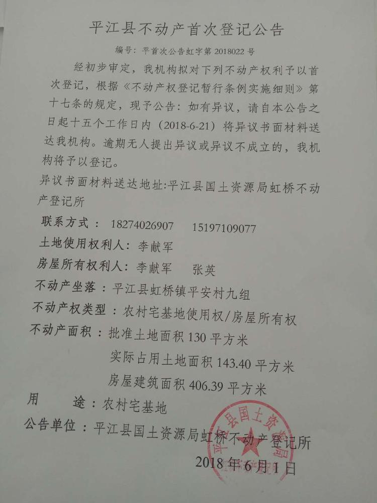 李献军 张英不动产首次登记公告平首次公告虹字第2018022号