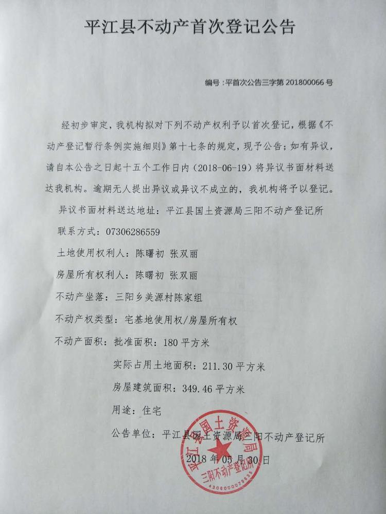 三阳乡美源村 陈曙初 张双丽 不动产登记发证