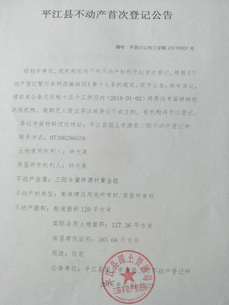 三阳乡黛坪源村 钟光泉 不动产登记发证
