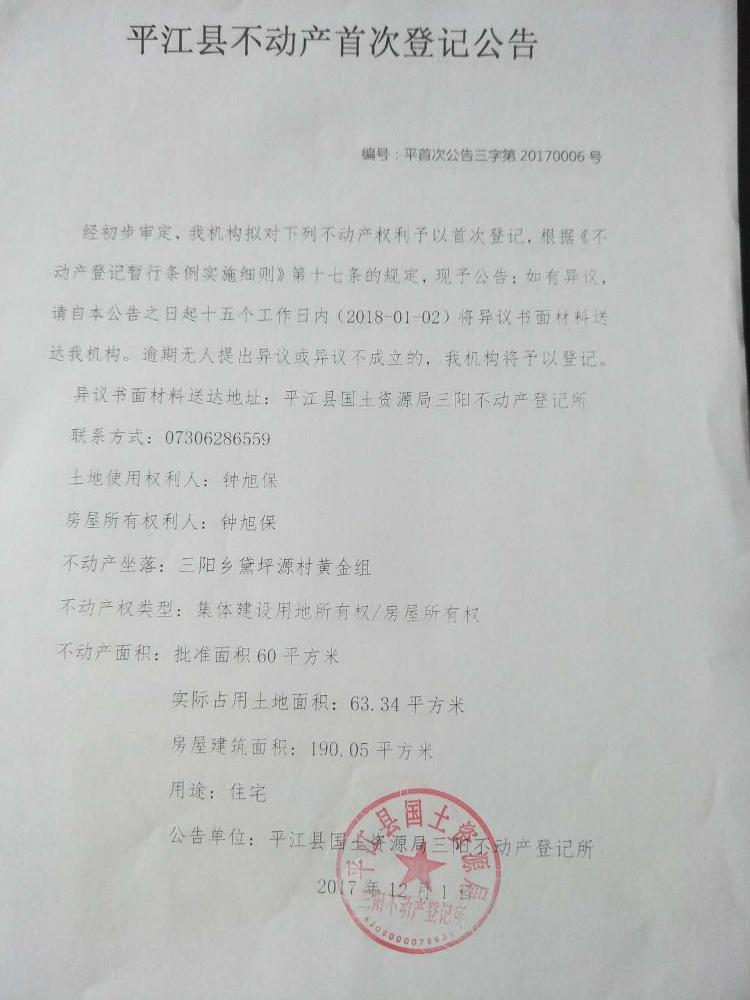三阳乡黛坪源村钟旭保 不动产登记发证