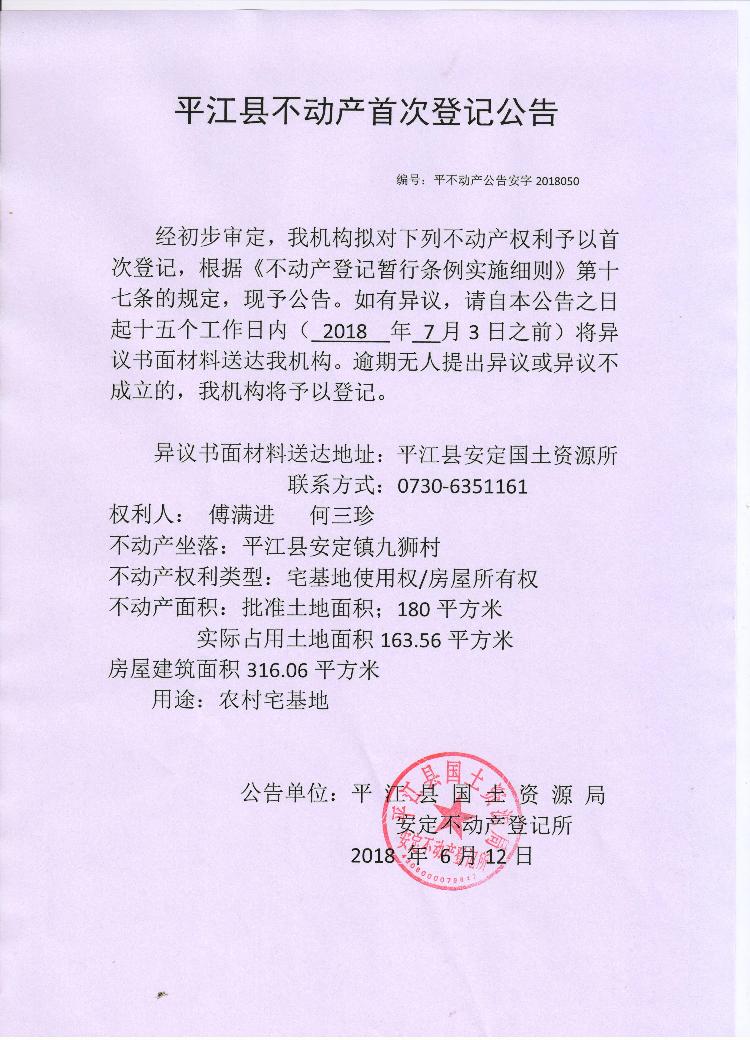 傅满进 何三珍平江县不动产首次登记公告安字2018050