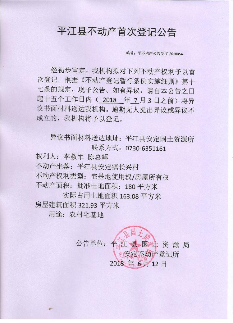 李救军 陈总辉平江县不动产首次登记公告安字2018054