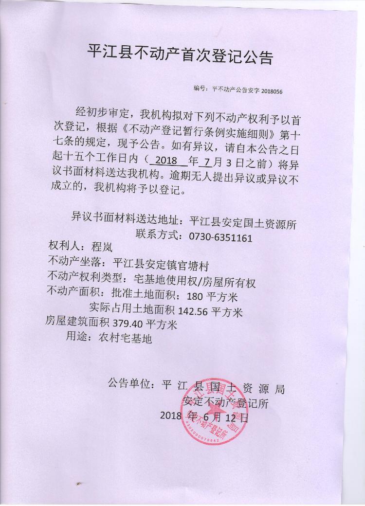 程岚平江县不动产首次登记公告安字2018056