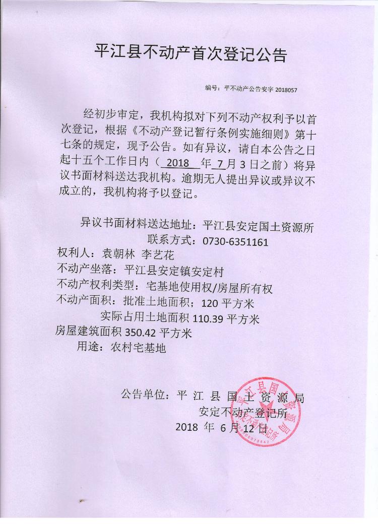 袁朝林 李艺花平江县不动产首次登记公告安字2018057