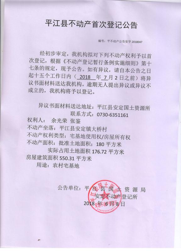 余光荣 张检平江县不动产首次登记公告平不产公告安字2018047