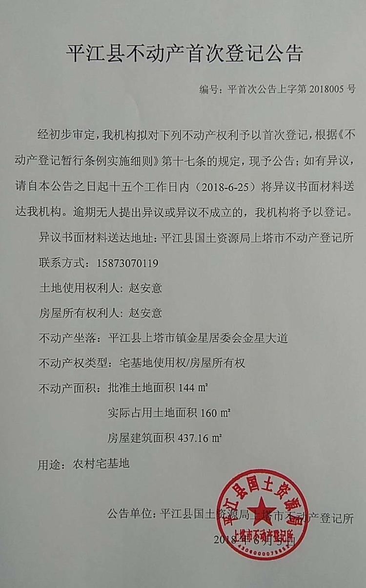 赵安意不动产首次登记公告平首次公告上字第2018005号