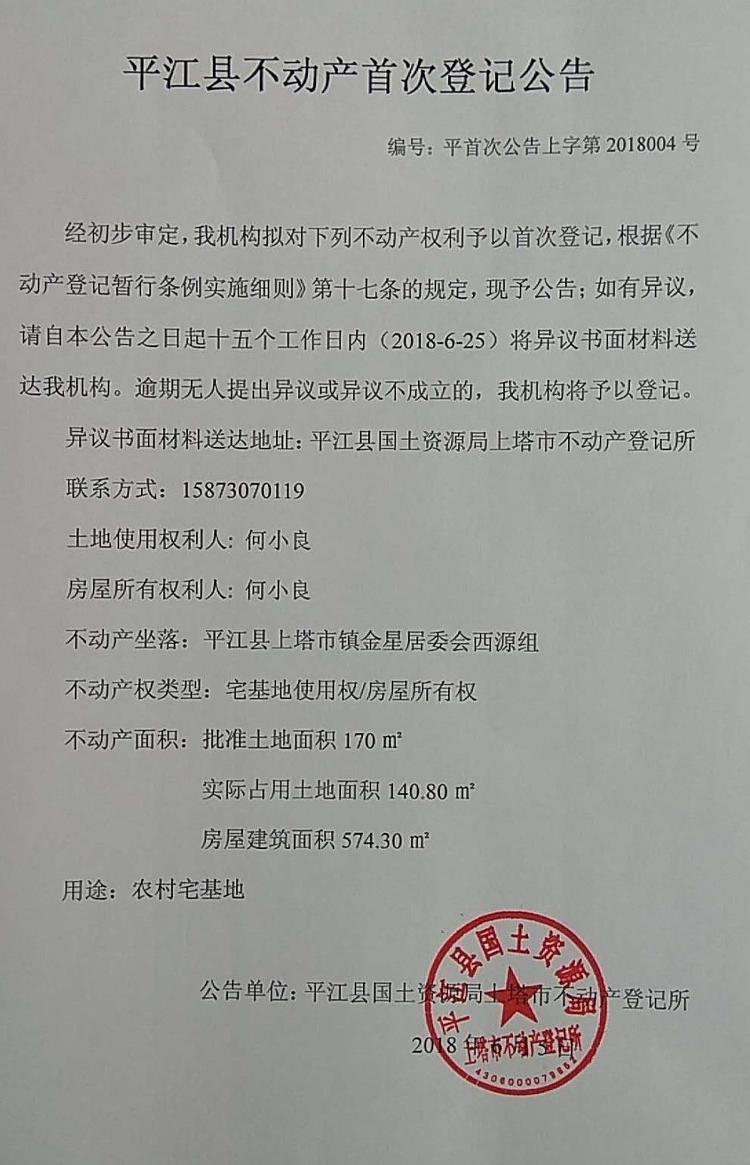 何小良不动产首次登记公告平首次公告上字第2018004号