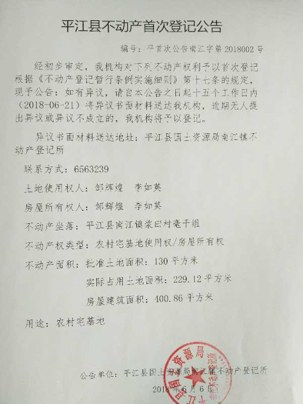 邹辉煌李如英平江县不动产首次登记公告平首次公告南江字第2018002号