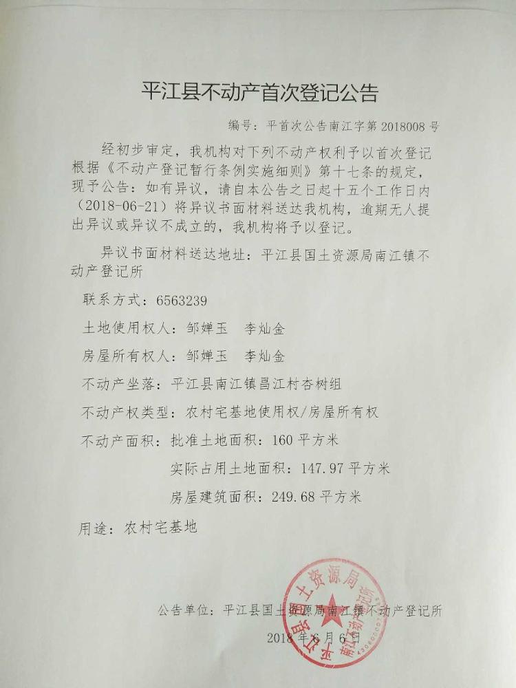 邹婵玉李灿金平江县不动产首次登记公告平首次公告南江字第2018008号