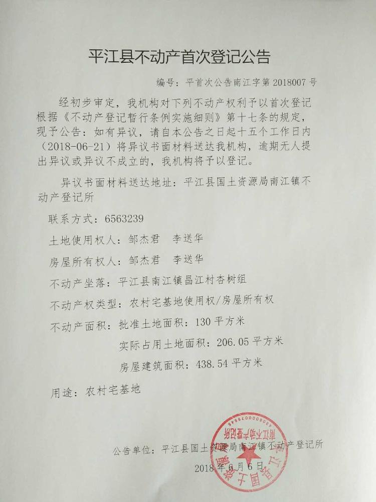 邹杰君李送华平江县不动产首次登记公告平首次公告南江字第2018007号