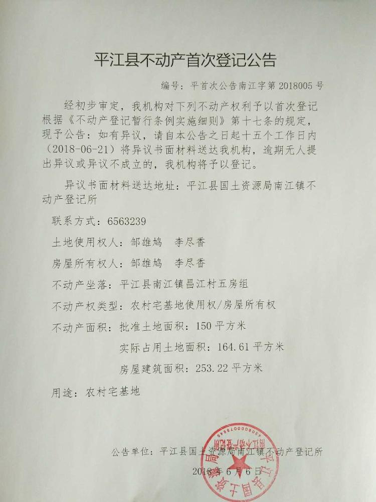 邹雄鸠李尽香平江县不动产首次登记公告平首次公告南江字第2018005号
