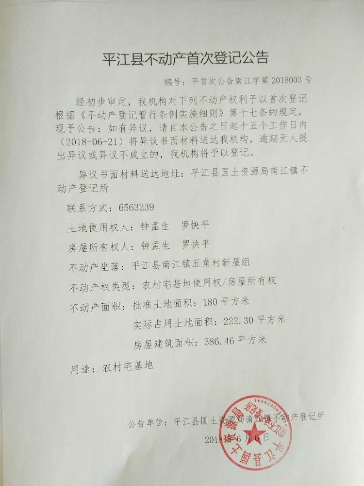 钟孟生 罗快平平江县不动产首次登记公告平首次公告南江字第2018003号