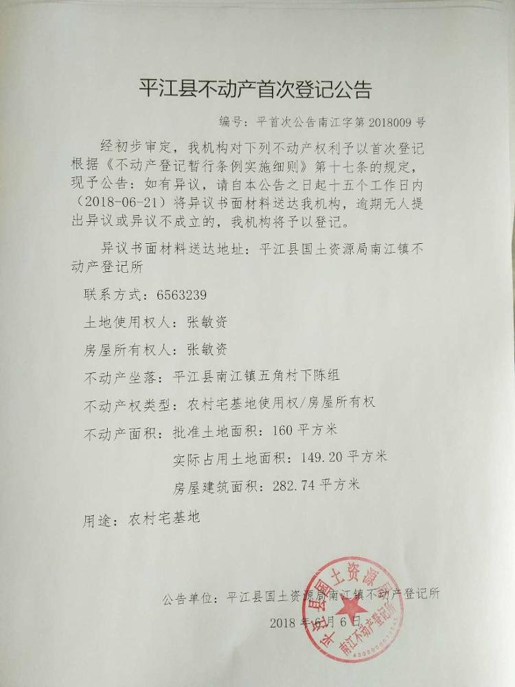 张敏资平不动产首次登记公告平首次公告南江字第2018009号