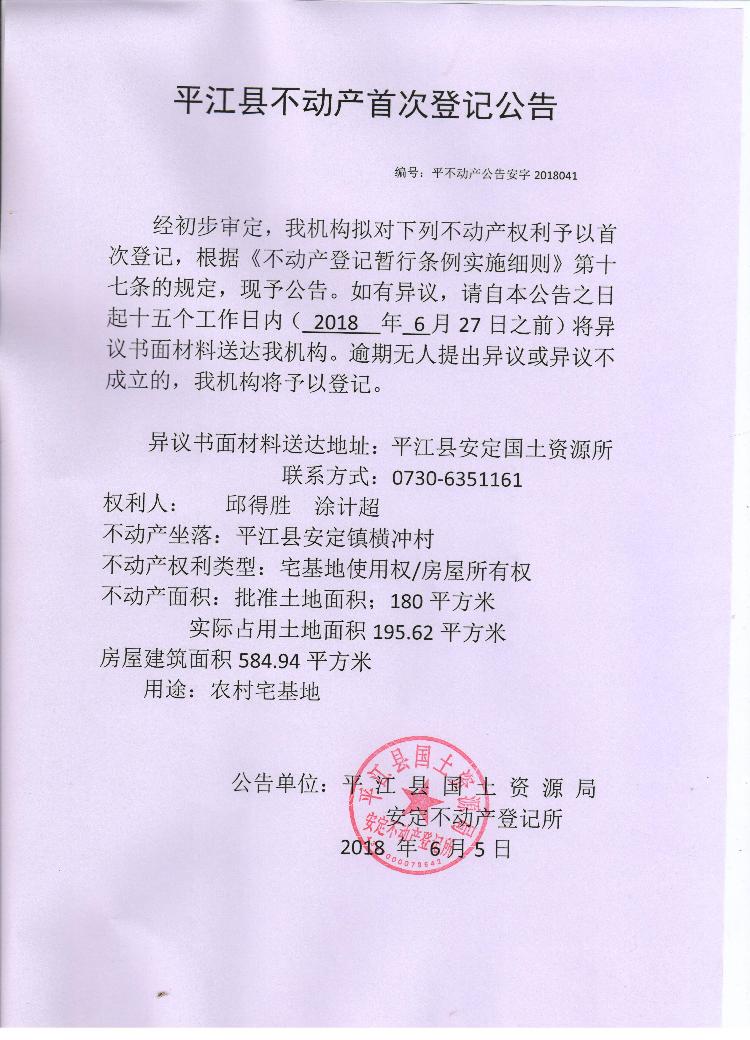 邱得胜 涂计超不动产首次登记公告平不动产公告安字2018041