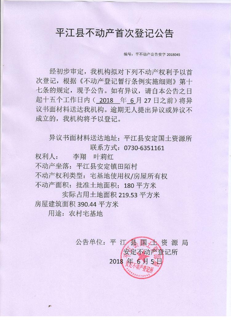 李翔 叶莉红不动产首次登记公告平不动产公告安字2018045