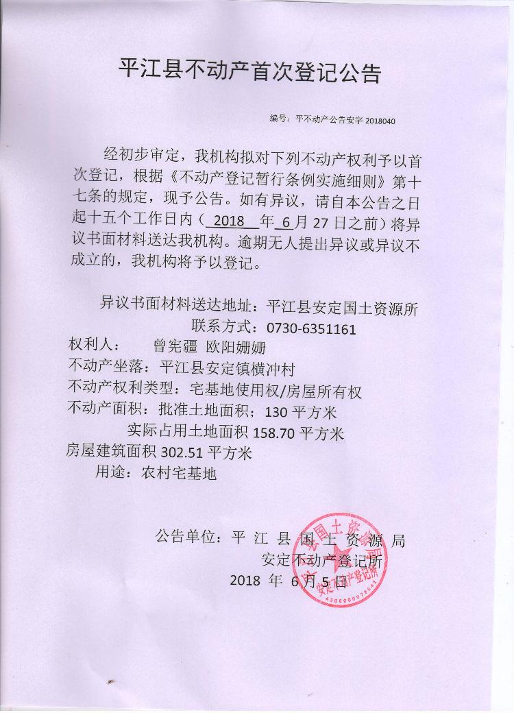 曾宪疆 欧阳姗姗不动产首次登记公告平不动产公告安字2018040