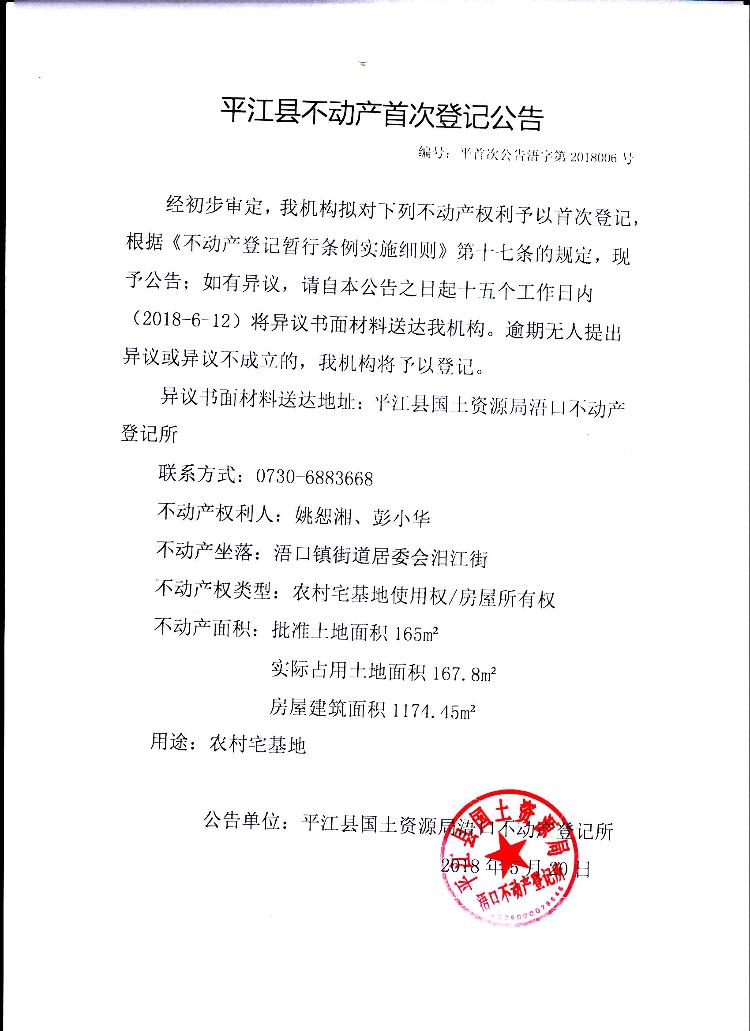 姚恕湘、彭小华不动产首次登记公告平首次公告浯字第2018006号