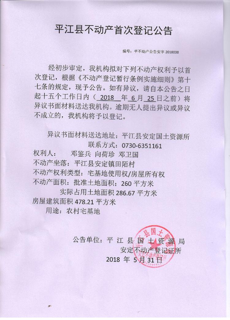 邓鉴兵 向荷珍 邓卫国不动产首次登记公告平不动产公告安字2018038