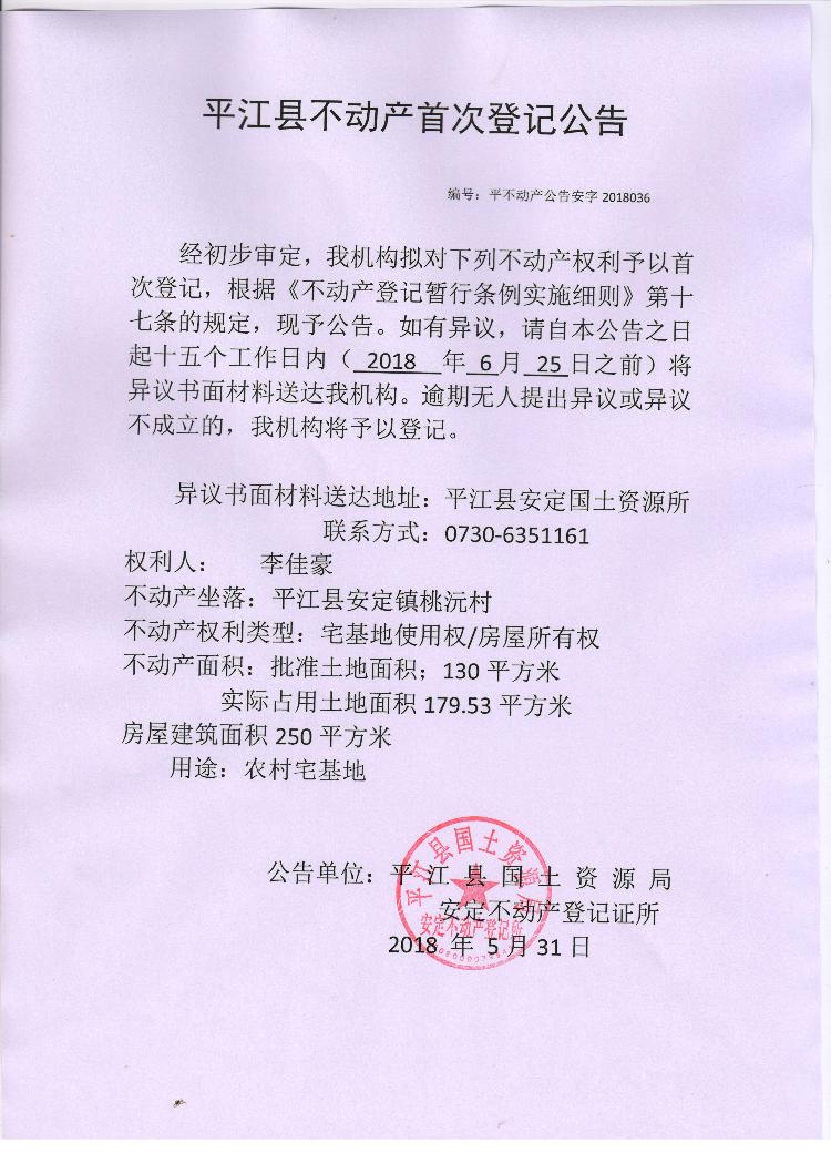 李佳豪不动产首次登记公告平不动产公告安字2018036