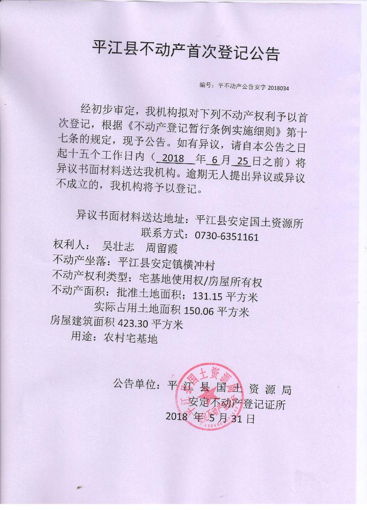 吴壮志 周留霞不动产首次登记公告平不动产公告安字2018034