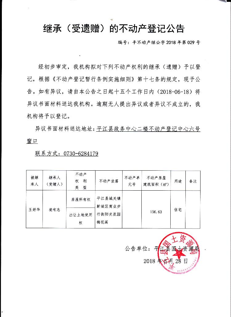 凌有志继承(受遗赠)的不动产登记公告平不动产继公字2018年第029号