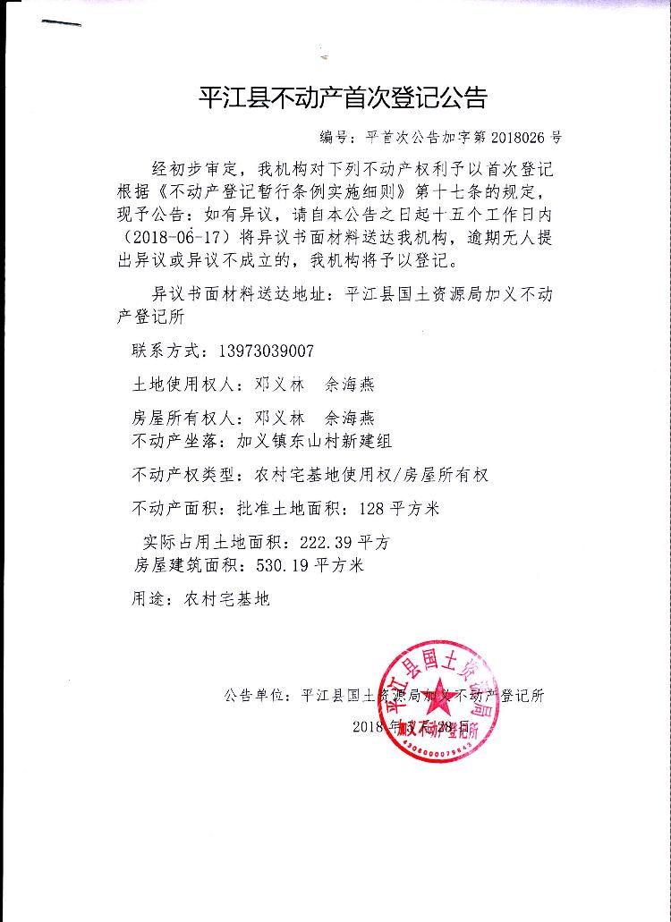 邓义林 余海燕不动产首次登记公告平首次公告加字第2018026号