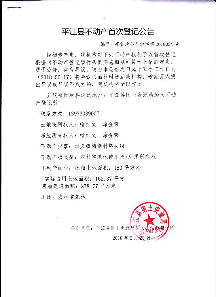 喻红文 涂金荣不动产首次登记公告平首次公告加字第2018024号