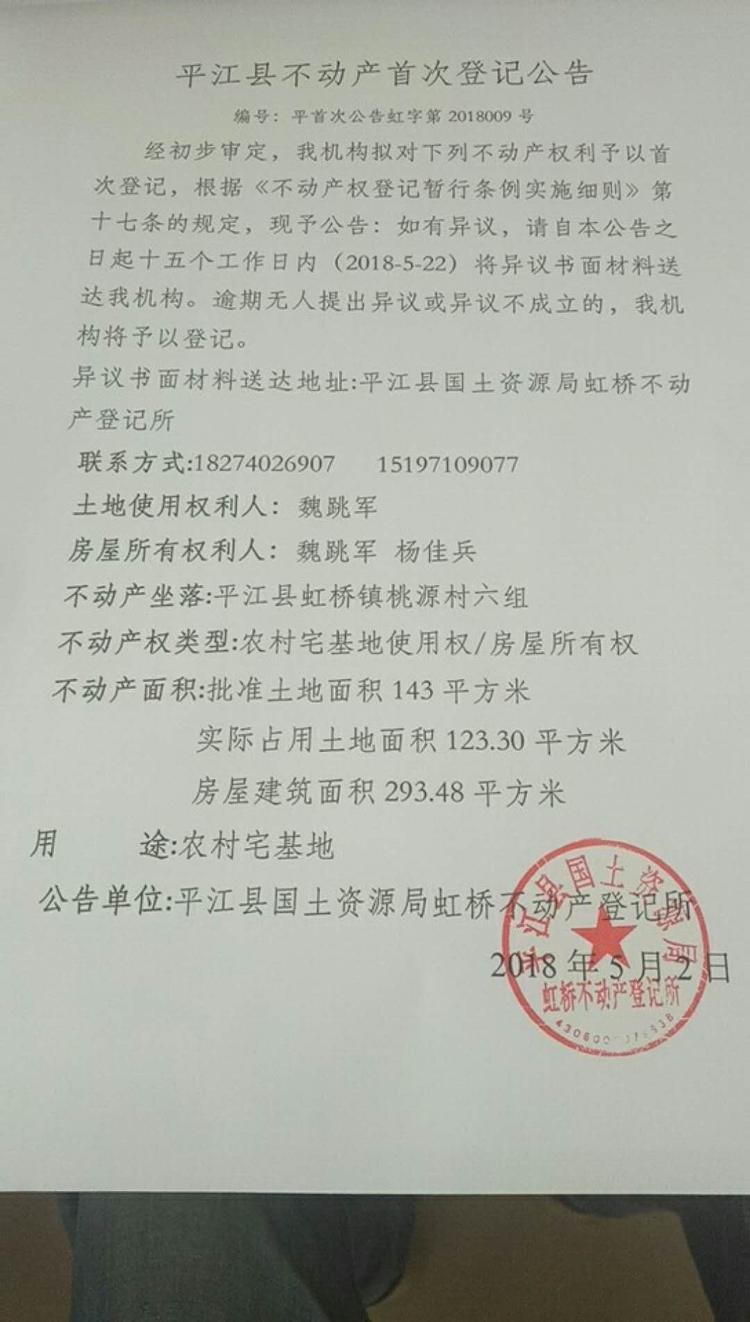 魏跳军 杨佳兵不动产首次登记公告平首次公告虹字第2018009号