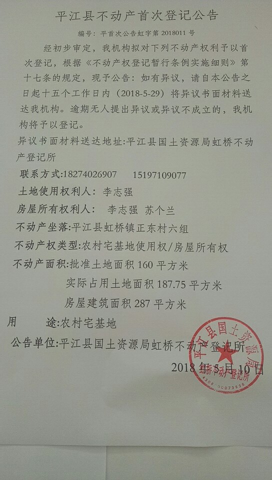 李志强 苏个兰不动产首次登记公告平首次公告虹字第2018011号