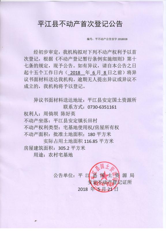 周倘坝 陈好英不动产首次登记公告平不动产公告安字2018028