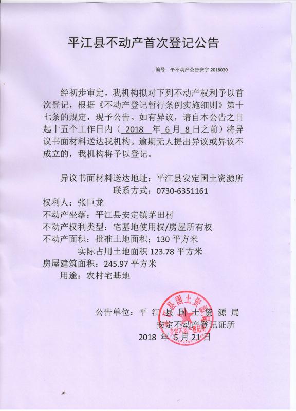 张巨龙不动产首次登记公告平不动产公告安字2018030