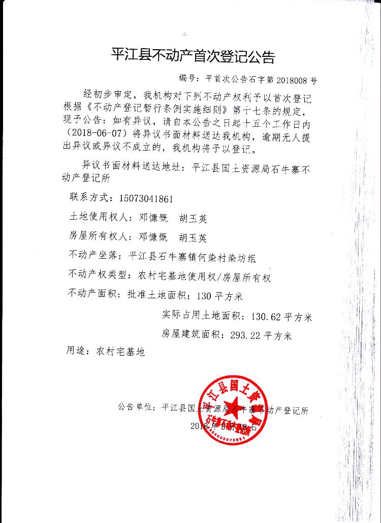 邓慷慨 胡玉英不动产首次登记公告平首次公告石字第2018008号