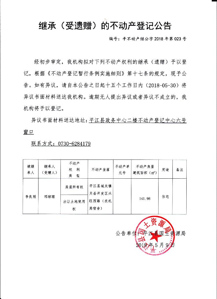 邓琼琚继承(受遗赠)的不动产登记公告平不动产继公字2018年第023号