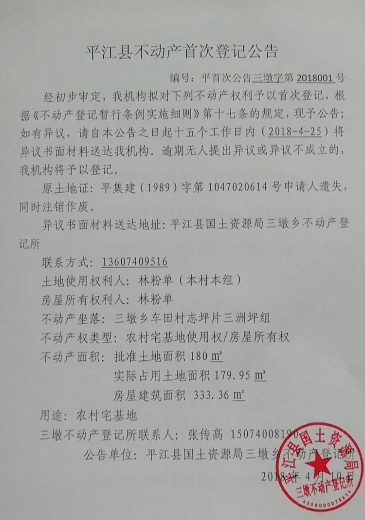 林粉单不动产首次登记公告平三墩字第2018001号